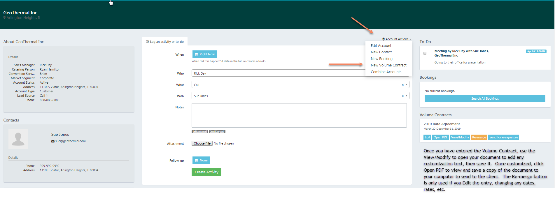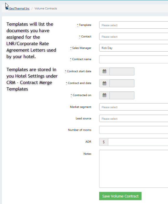 Track Locally Negotiated Rates for short-term projects, annual commitments, etc., known as Volume Contracts. You can record room night potential when quoting a company rate and link it to your merge document template to create a rate agreement letter. The Volume Contract records transactions (e.g., a company with 500 nights per year will receive quoted rates and a corporate rate plan). These contracts appear in your weekly sales activity reports, showing potential transient volume alongside group room and catering sales.