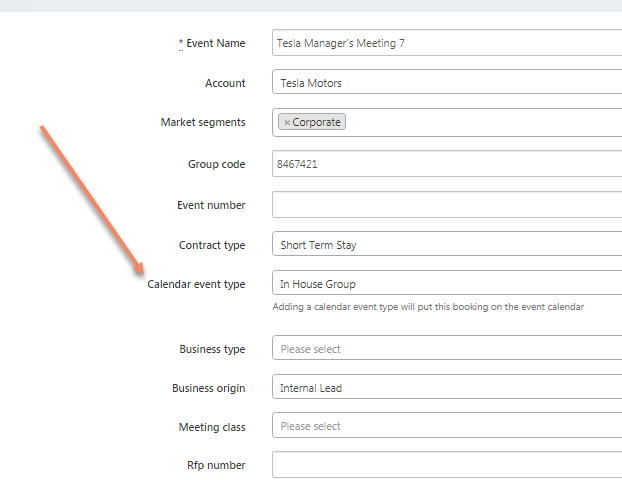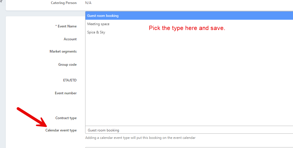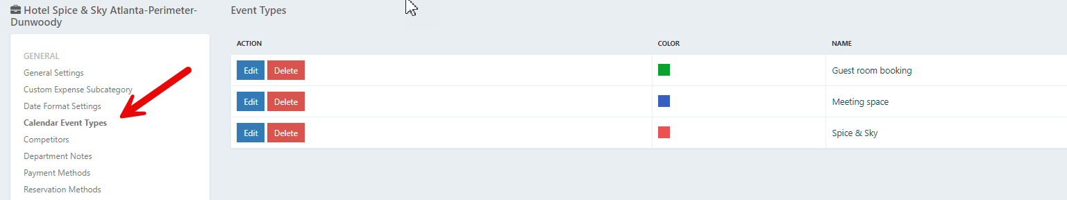 NOTES: You can customize the Event Type and calendar color in your Settings for your Hotel Name, under Calendar Event Types.