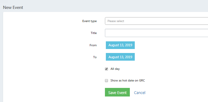 Click the Show as a Hot Date on the GRC if you want to highlight the date in red when viewing the GRC (Group Rooms Control Log) . This is good for creating an Area Event type in your settings, and then you can add high demand generating things like Citywide Conferences, Tournaments, etc.