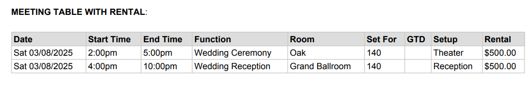 Once added as noted above, the Room Rental will populate into a Contract table as setup in y our merge templates.
