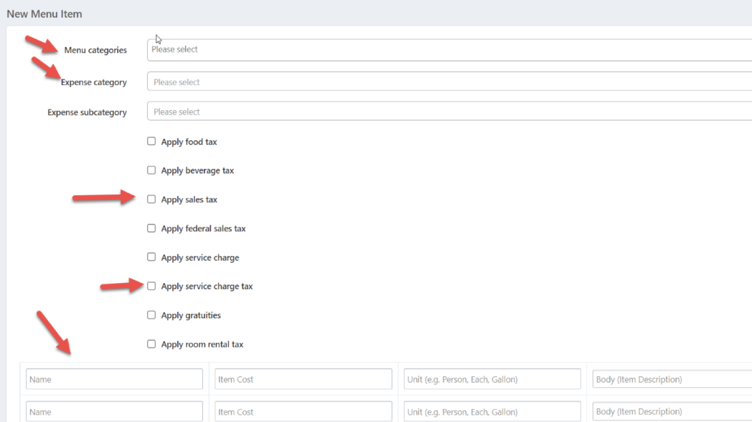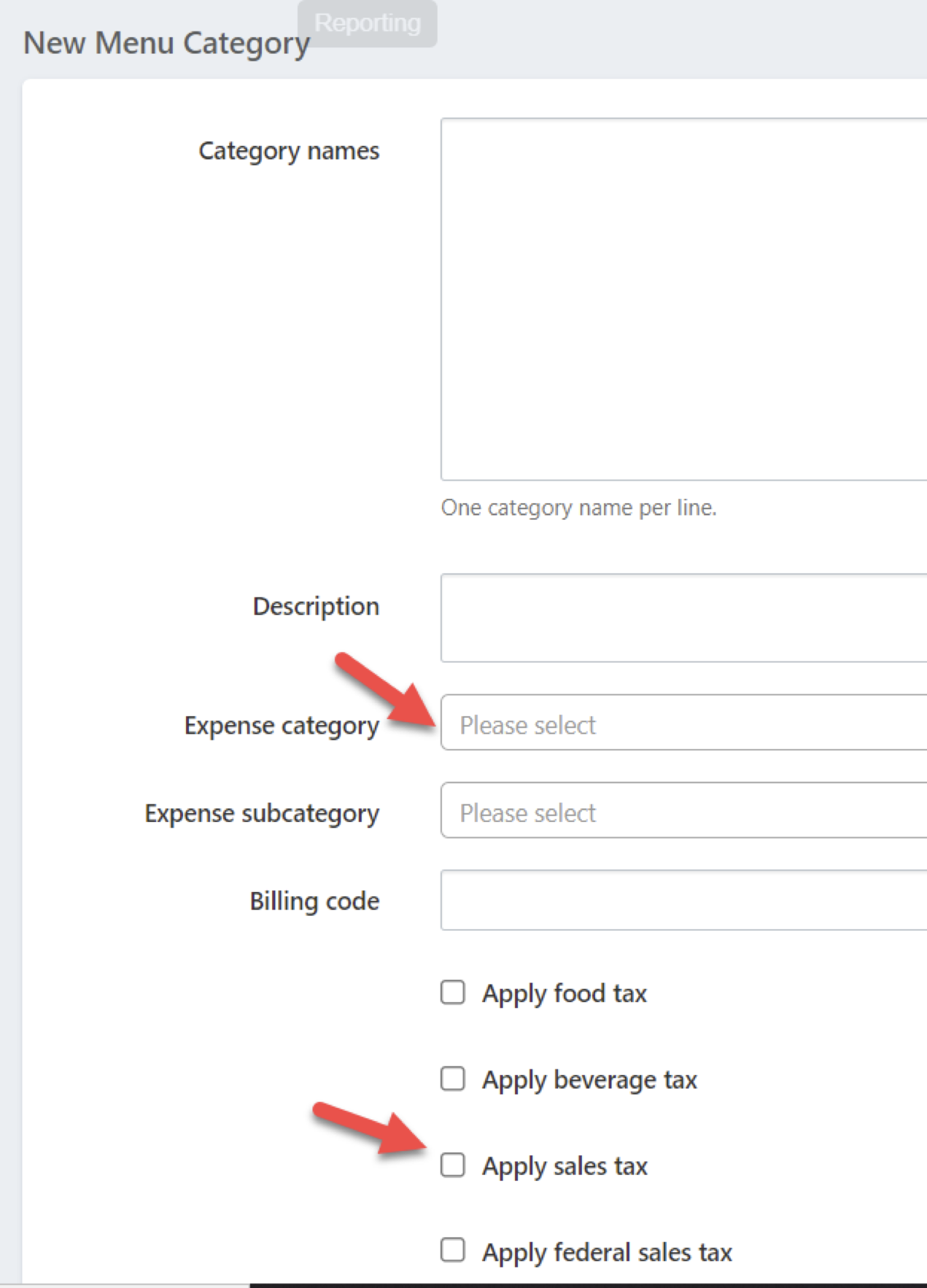 Check the Service Charge and Sales Tax boxes that will apply to all menu items in this category
