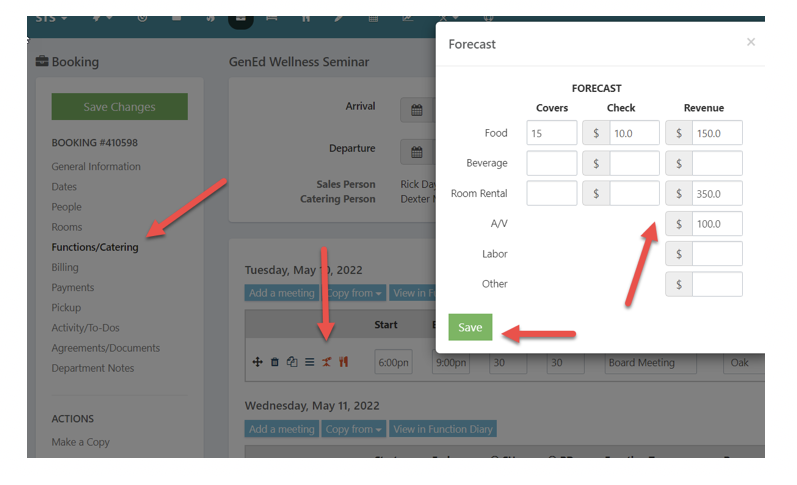 Note: You will see these entries in Forecast on Catering reports, or the projected revenues for future dates on reports.