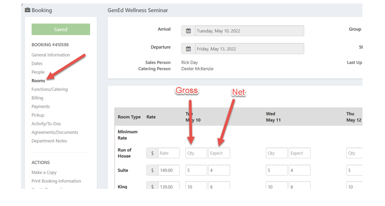 Gross Rooms – see the Booking, Rooms Tab. The Rate and entry in the QTY column are used on a group contract and is used as Gross data on reports
