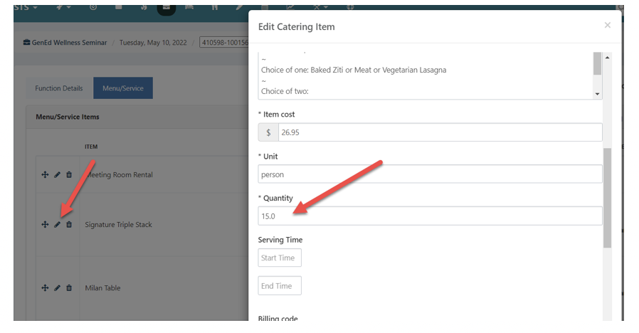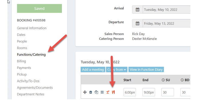 Click the Knife/Fork icon next to the first function, to open the booking in the Catering detailing window