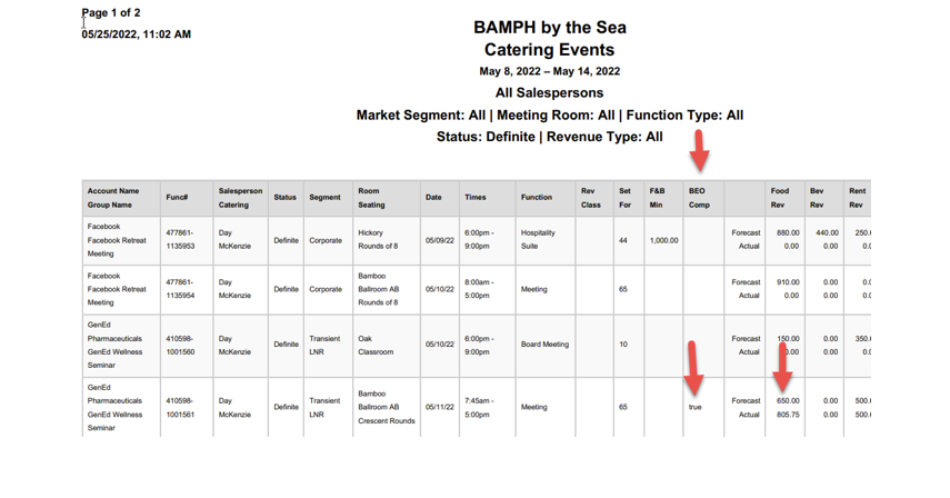 You will see in Catering reports a BEO COMP or COMP column, with a check mark or True noted. This is the indicator that your BEO’s are marked complete, and you will see actual revenues. If a check or true is not the BEO COMP or COMP column, this is a good checkpoint to make the update to accurately report on actual catering sales.