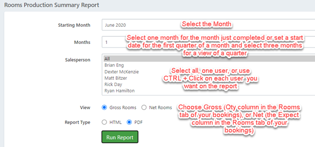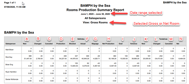 This report will create the business produced by salesperson within the date range selected for either Gross or Net room blocks. This will allow you to evaluate the new business, business changes, cancellations and comparison to an entered production goals per person and relative information with actual pickups.