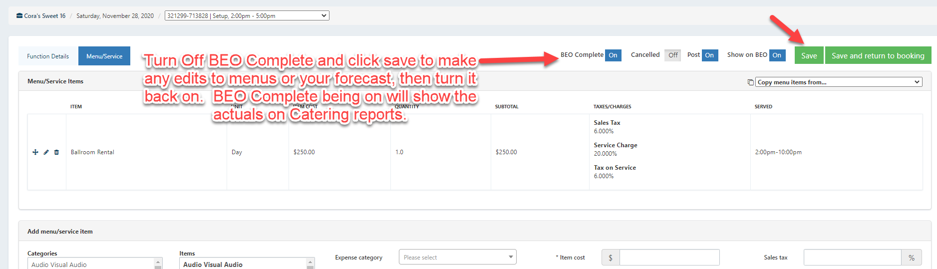 The BEO Complete, when turned on for functions, updates the function and populates the actual revenues for the reports. BEO Complete is used to indicate that events have been finalized, and quantities, prices, or revenues are considered final.