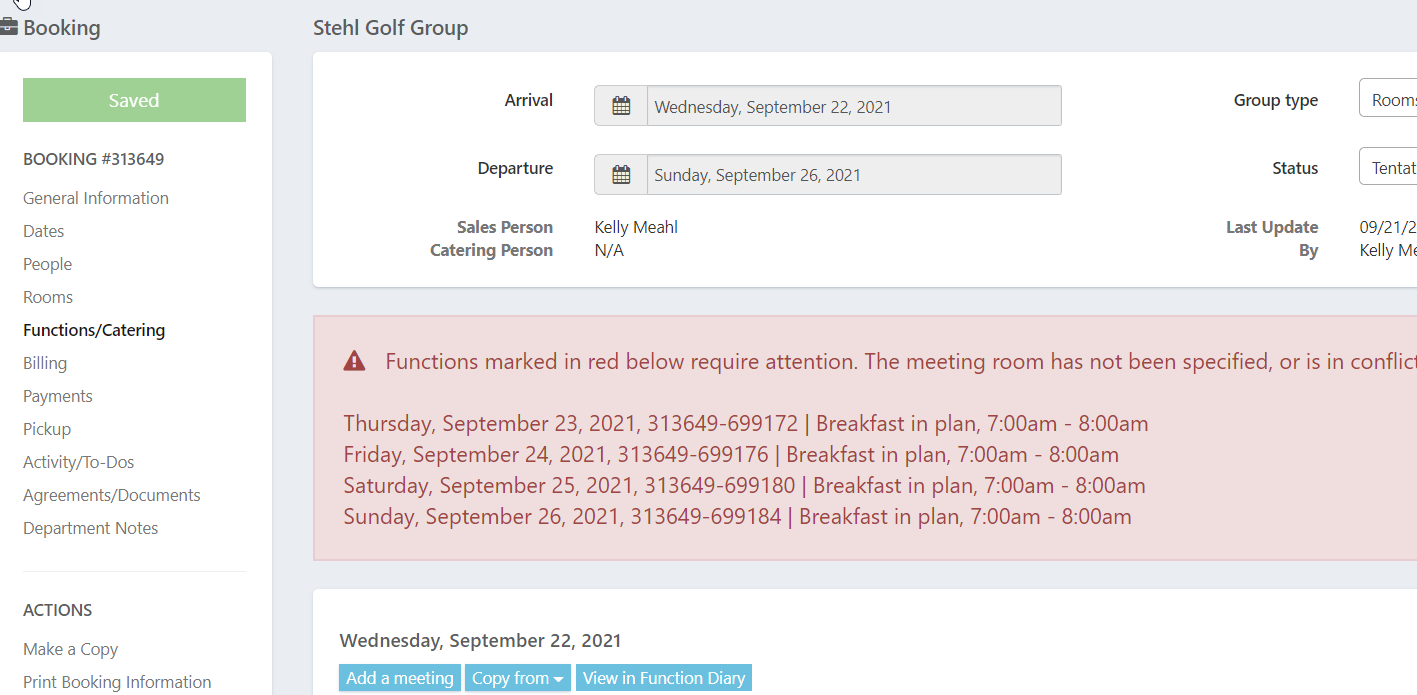 When you are blocking function space, or perhaps copying a past booking to a new set of future dates, it is important to check your Function Space Availability prior to creating the new booking. When a function room is booked and in use by another group in STS, you may see the below example message in the Functions/Catering tab of your booking.