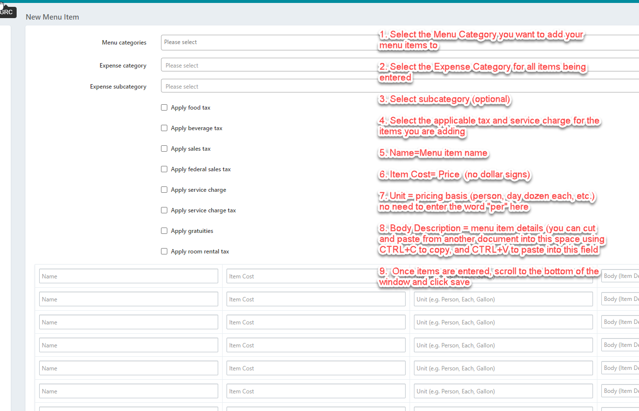 Once you establish your Menu Categories and how you want to organize menus, you can then begin adding menu items to a selected Menu Category. Menu items should be entered into the category based on the Expense Category selected, as this will impact the tax rates, appearance on the catering reports, and where the items will print on your BEO.