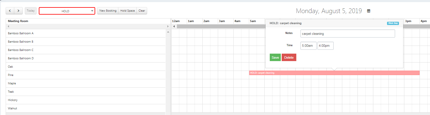 Users can enter a Hold Space for a meeting room on a date. This is useful for maintenance issues, carpet cleanings, as well as for a temporary posting to show users that perhaps a salesperson is working with a group on a date but has not entered the function space formally within a booking.