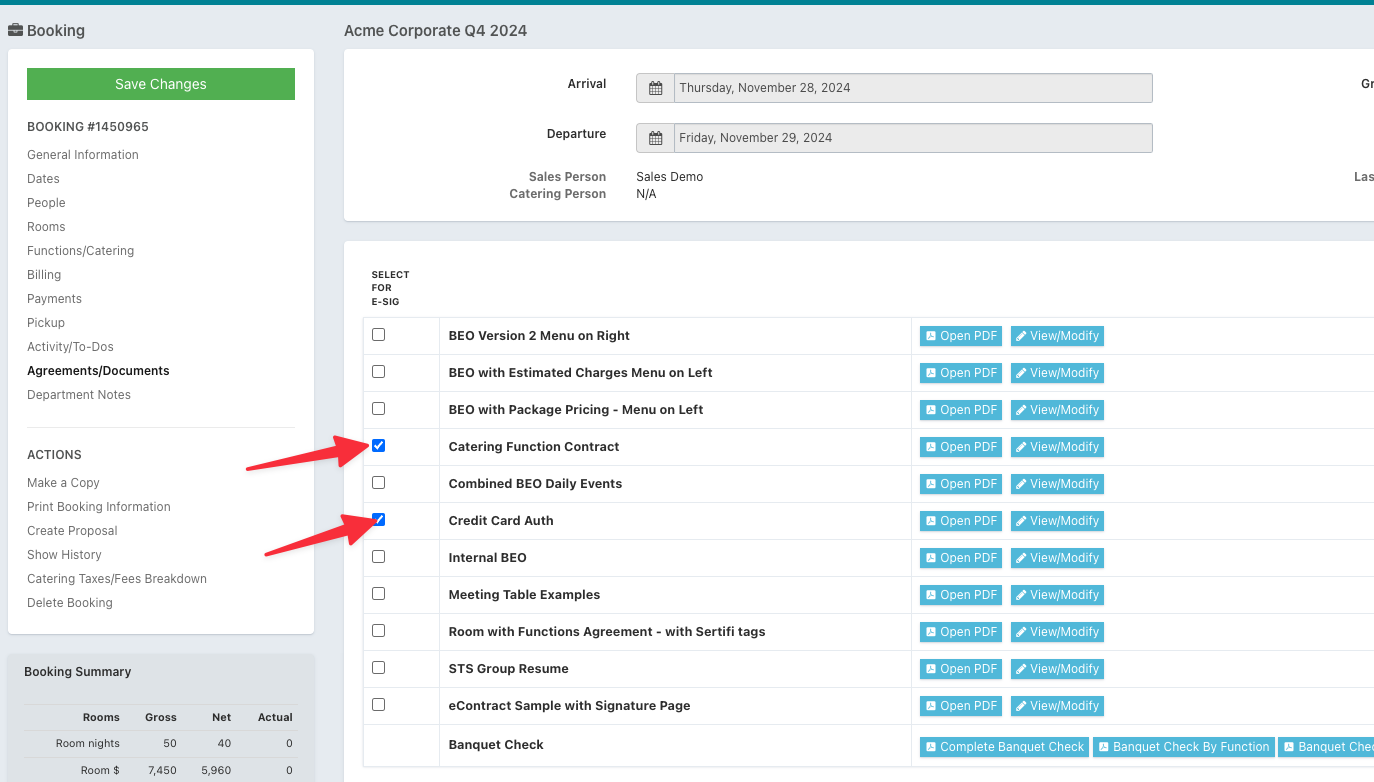 Start by selecting the 'Agreements/Documents' tab in any booking. Then, select the documents you'd like to send for e-signature by checking the box next the the document name. If you'd like to preview the agreement prior to sending, select 'Open PDF' or if you'd like to make changes to the agreement prior to sending, select 'View/Modify'.