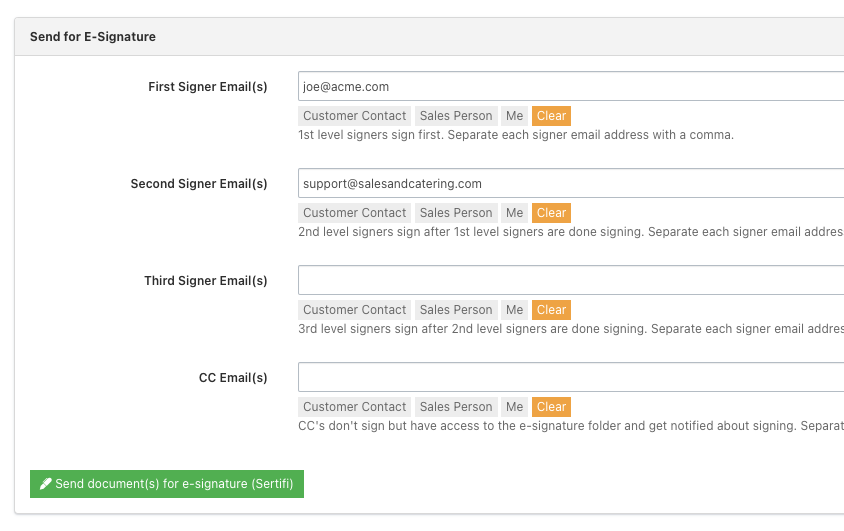 Next, confirm who needs to sign and the correct order. The order of the individuals must match the signing order on the documents. For instance, if our Catering Function Contract requires the customer to sign first, then a countersignature from the sales manager, it has to be set up the same way here. You'll also notice there are convenient buttons to select from the customer contact, the sales person, and the currently logged-in user, so entering email addresses manually is usually not necessary.