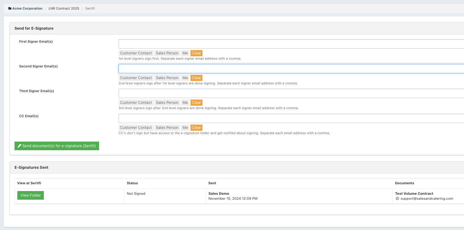 Click the "Sertifi" button, and you'll be taken to a new page where you can send the Volume Contract for e-signature.