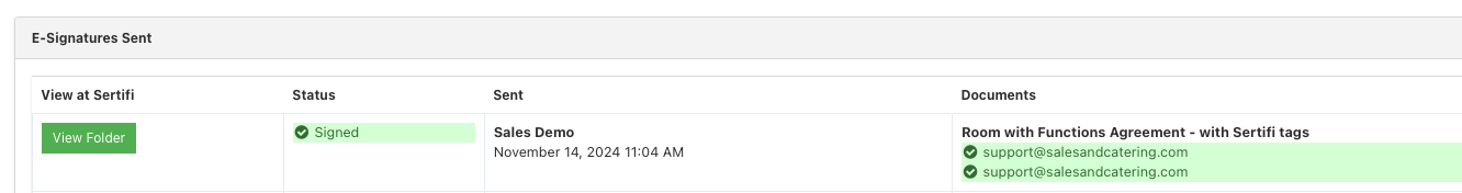 As the signing process progresses, you will receive email notifications as configured within Sertifi. You will also see updates in the Agreements/Documents tab of the booking: